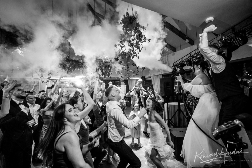 To zdjęcie lubię szczególnie. Wracam do niego co jakiś czas, bo ma w sobie wszystko, co w reportażu kocham najbardziej. Energia. Chaos, piękny dym. Światło, ręce w górze, śmiech, emocje, które aż wychodzą poza kadr. Zdjęcie powstało na weselu Justyny i Rafała w sali weselnej Dwór Bogucin . Cudowną atmosferę muzyczno – dymową stworzył Zespół Havana.